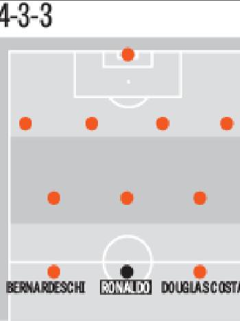 4-3-3 – Di recente la Gazzetta dello Sport ha immaginato alcuni potenziali schieramenti per la Juventus 2018-2019. Si parte dal 4-3-3, schieramento nel quale Cristiano Ronaldo diventerebbe per forza di cose la prima punta moderna, quella in grado di assicurare i movimenti necessari anche per gli inserimenti dei centrocampisti e con due ali disposte al sacrificio come Bernardeschi e Douglas Costa.