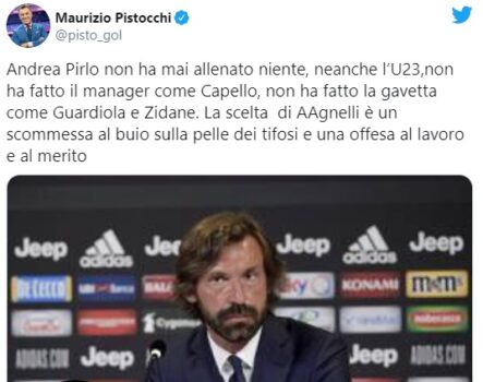 “Andrea Pirlo non ha mai allenato niente, neanche l’U23, non ha fatto il manager come Capello, non ha fatto la gavetta come Guardiola e Zidane. La scelta di Agnelli è un scommessa al buio sulla pelle dei tifosi e un’offesa al lavoro e al merito”.